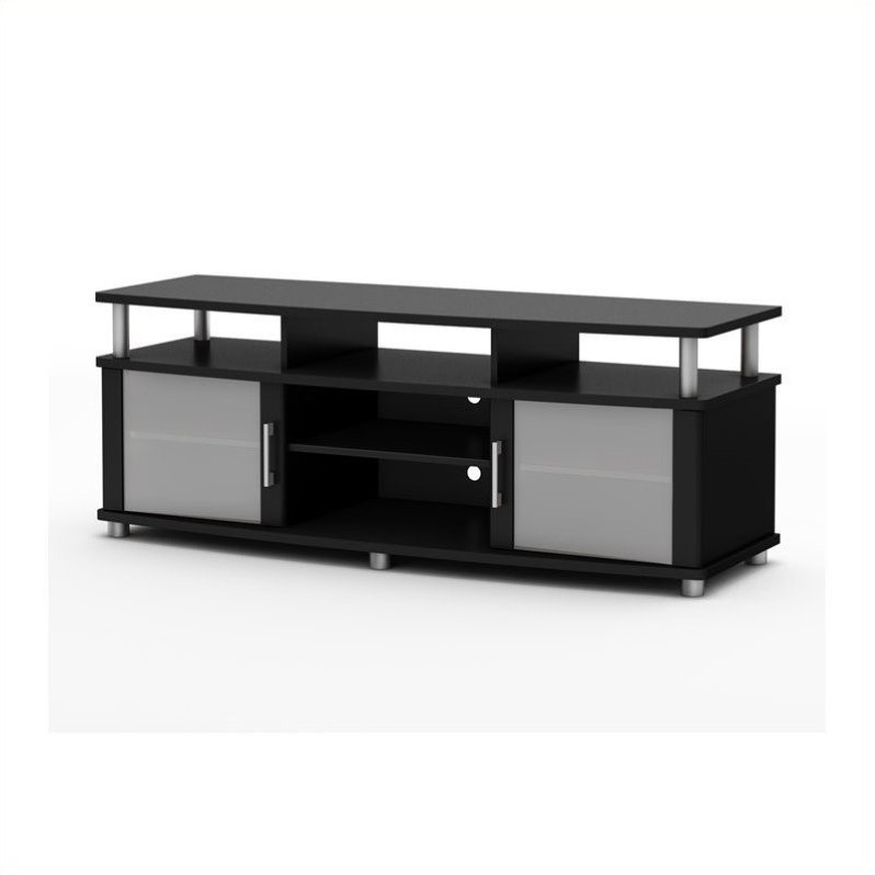 | South Shore - TV Stands - 4270677 - This TV stand combines curved lines, metal accents, frosted glass and a Pure Black finish for popular contemporary style. It is a perfect blend of form and function, featuring both open and closed storage options and a large surface perfect for ACL TVs of 60'' or less.. The living room has never been so tidy and organized! Metal handles with a Matte Silver finish that match metal look-alike legs; Metal accents and sleek lines for a contemporary style . Comes with 2 stylish frosted glass doors for closed and discrete storage; Accommodates LCD and plasma televisions up to 60’’; TV stand able to support a television of up to 185 lbs; Rounded corners for increased safety; Mix of open and closed storage compartments ideal for a tidy living room; Features 1 adjustable shelf between the doors; Features 1 adjustable shelf behind each door; Features 5 open storage spaces perfect for electronic devices; Each storage compartment features a hole in the back panel for easy and convenient wire management; The back surface is not laminated; In order to reduce the risks of damage to a minimum during shipment of your furniture, our packaging is ISTA 3A certified; Manufactured from eco-friendly, EPP-compliant laminated particle board carrying the Forest Stewardship Council (FSC) certification; Made of non-toxic materials and components . Specifications: Overall Product Dimensions: 19""Height x 59""W x 22""D; Weight Product: 104 lbs. .