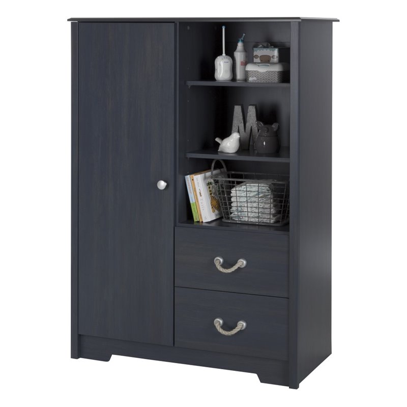 | South Shore - Baby Armoires - 10419 - With its unique handles and trendy finish, the Aviron collection has a truly original nautical style! It’s sure to be the centerpiece of your kid’s room, and its handy storage spaces make it really useful. All hands on deck! With its unique handles and trendy finish, this piece from the Aviron collection has a truly original nautical style! It’s sure to be the centerpiece of your kid’s room, and its handy storage spaces make it really useful. All hands on deck!Finish: BlueberryMaterial: Non-toxic Laminated particleboardRope like upper handlesBehind the door: 5 storage spaces (3 adjustable shelves, 1 fixed)3 open storage spaces (2 adjustable shelves)Metal drawer slidesCan be used with South Shore baskets (100031). Each shelf can support up to 25 lbPackaging tested and certified to reduce the risk of damage during shipmentBaskets and other accessories not included. Clean with a soft dry clothShips in a heavy box, make sure to have a friend with you. Meets or exceeds all North American safety standardsRequires complete assembly by 2 adults (tools not included)5-year quality guarantee. Any questions? Contact the manufacturer, available 7/7 by phone, email or chat. Specifications:Overall Product Dimensions: 54.25'' H x 39.5'' W x 18'' DProduct Weight: 137 lbs
