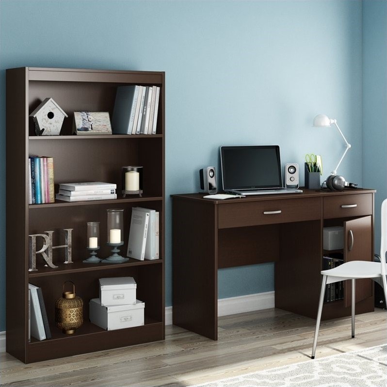 | South Shore - Computer Desks - 72590707259767PKG - South Shore Axess 4 Shelf Bookcase in ChocolateThe Axess Bookcase is constructed from laminated engineered wood and has a warm chocolate finish. It features two adjustable shelves and two fixed shelves for all your storage needs. With a sleek contemporary styling, the functional and attractive Axess Bookcase offers a lasting appeal you will enjoy for many years. Bookcase made of laminated engineered woods ; Chocolate finish ; Four shelves (two adjustable, two fixed) ; Contemporary style ; Ready to assemble ; Manufacturer limited 5-year warranty . Specifications: Overall Dimensions: 58"" H x 30.75"" W x 11.5"" D ; Weight: 77 lbs ; Shipping Carton Dimensions: 4"" H x 64"" W x 14"" D . Recommended Care: Use a soft or slightly damp cloth for cleaning ; Never use an ammonia-based cleaner as it will damage the finish . South Shore Axess Small Computer Desk in ChocolateNeed to tidy up your home office? This Axess collection small desk is perfect for all your storage needs! Its design includes all the space you need for a well-organized workspace thanks to its closed storage spaces. In addition, the work surface is greatMetal handles in a Pewter finish Neutral finish which adapts perfectly to any type of décorThe work surface is great for laying out homework or setting down a laptopFeatures 2 storage spaces behind the door divided by 1 adjustable shelfCut out hole in the back panel behind the door which allows for easy wire managementFeatures two handy storage drawers: a small one, for pens and pencils, a calculator and all those handy little itemsa large one, for your laptop computer and booksMetal drawer slides for smooth gliding The back surface is not laminatedComplete assembly required by two adults (tools not provided)Manufactured from eco-friendly, EPP-compliant laminated particle boardMade from non-toxic materials and componentsSpecifications:Overall Product Dimensions: 30.25""H x 47.25""W x 18.75""D5 Years Warrant