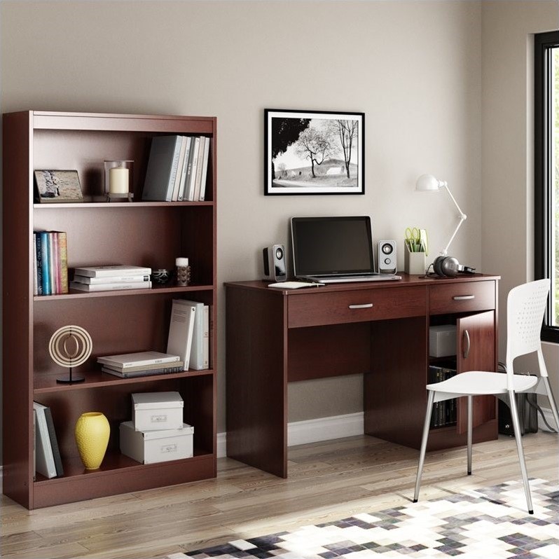 | South Shore - Computer Desks - 72460707246767PKG - South Shore 4 Shelf Bookcase in Royal CherryIdeal for your binders, books or decorative items, this versatile 4-shelf bookcase can meet your every need. Its warm royal cherry finish and refined lines harmonize seamlessly with virtually any decor. Both functional and attractive with its sleek contemporary styling, this bookcase is sure to enhance the look of any room in your home.Shelf bookcase2 adjustable shelves and 2 fixed shelfContemporary styleManufactured from recycled CARB compliant laminated particle panels Made of EPP certified panels (Environmentally Preferred Product)Ready to assemblePackaging is ISTA 3A-certified to ensure its integrity and your total satisfaction5-year warrantyMade in MexicoSpecifications:Overall Dimensions: 58"" H x 30.75"" W x 11.5"" DWeight: 57 lbsSouth Shore Axess Small Computer Desk in Royal CherryNeed to tidy up your home office? This Axess collection small desk is perfect for all your storage needs! Its design includes all the space you need for a well-organized workspace thanks to its closed storage spaces. In addition, the work surface is greatMetal handles in a Pewter finish Neutral finish which adapts perfectly to any type of décorThe work surface is great for laying out homework or setting down a laptopFeatures 2 storage spaces behind the door divided by 1 adjustable shelfCut out hole in the back panel behind the door which allows for easy wire managementFeatures two handy storage drawers: - a small one, for pens and pencils and a large one, for your laptop computer etcMetal drawer slides for smooth gliding The back surface is not laminatedComplete assembly required by two adults (tools not provided)ISTA 3A certified packagingManufactured from eco-friendly, EPP-compliant laminated particle boardMade from non-toxic materials and componentsSpecifications:Overall Product Dimensions: 30.25""H x 47.25""W x 18.75""D5 Years WarrantyMade in Canada