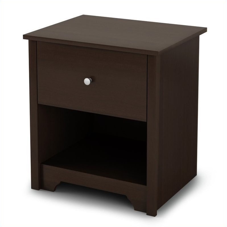 | South Shore - Nightstands - 3119062 - The Breakwater Nightstand has a laminated particle board construction with a chocolate finish. This nightstand features one drawer and an open compartment for ample storage. It has Smart Glide drawer slides for a smooth gliding motion and metal handles for easy access to your belongings. With sleek, clean straight lines the Breakwater Nightstand will be a perfect compliment to your bed or the corner of your bedroom. The transitional style of the Breakwater collection from South Shore Furniture provides a calming, comforting atmosphere to any bedroom. It features simple, clean lines that are softened by a decorative kickplate. The beauty of the warm finish is enhanced by metal hardware for a stylish contrast. The minimalist design of the South Shore Furniture Breakwater collection is perfect for today's styles. Nightstand made of laminated particle board ; Chocolate finish ; One drawer ; Smart Glide drawer slides feature stops and built-in dampers ; Metal knob in nickel finish ; Easily accessible open storage space ; Decorative kickplate ; Transitional style ; Made in Canada ; Ready to assemble Made of EPP certified panels (Environmentally Preferred Product Packaging is ISTA 3A certified Manufacturer 5-year limited warranty . Specifications: Overall Dimensions: 23.25"" H x 21.25"" W x 17"" D Drawer Interior Dimensions: 15.5"" W x 14"" D Shipping Carton Dimensions: 6"" H x 27.5"" W x 19.75"" D ; Weight: 33 lbs . Recommended Care: Never let liquids or damp cloths sit on this furniture ; Do not put plastic or rubber rings under appliances ; Use cloth of felt protectors ; To avoid dulling of the finish, do not place furniture in direct sunlight ; Never use ammonia-based cleaning products, as they will damage the finish ; To clean, use a soft or slightly damp cloth, then wipe with a clean, dry cloth .