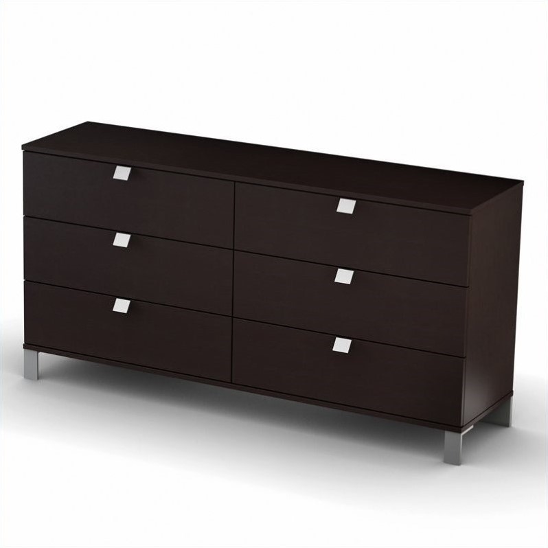 | South Shore - Dressers - 3259010 - With its rich chocolate finish and sleek, contemporary lines, this spacious double dresser will enhance any bedroom. Fitted with elegant angled metal handles and front L-shaped legs, this superb double dresser is crafted from fine engineered-wood materials and is guaranteed to be free of any defects by a comprehensive five-year warranty. Assembly required. Double Dresser has a Chocolate finish ; Constructed of CARB compliant materials; 6 spacious drawers ; Drawers slide on nylon ; Elegant front metal legs ; Squared metal knobs (inclined position) ; 9 additional pieces round out this elegant casual contemporary grouping ; Manufactured from engineered-wood products ; 5-year warranty ; Assembly required ; Perfect for girls . Specifications: Overall dimensions: 59.5""W x 29.75""H x 16.5""D; 106 lbs..
