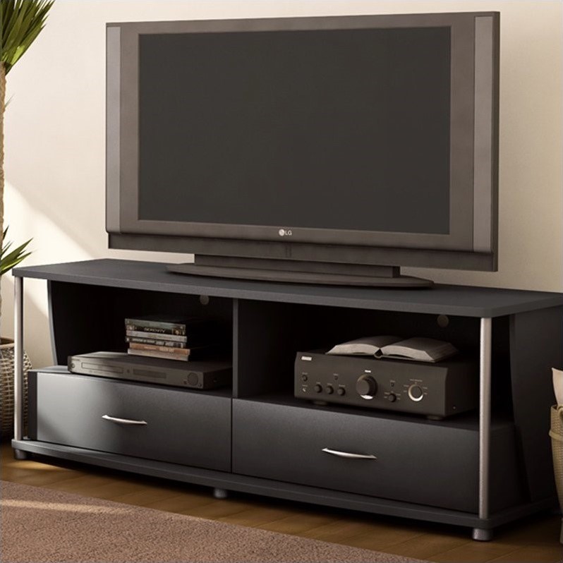 | South Shore - TV Stands - 4270662 - Meet the product of form and function in the City Life TV stand. Purely evolved to meet your entertainment storage needs, this TV stand sports a midnight-hued pure black finish on the outside and a surplus of organizational features on the inside. Two drawers with Smart Glide drawer glides offer enclosed space for CDs, DVDs or other entertainment necessities, while 2 open shelves provide room for electronic components or games and movies. Your streamlined space shouldn't be marred by unsightly wires, so this smart stand manages them through 4 holes at the rear. Completing the stand's contemporary look are silver-finished dowels, legs and drawer pulls that stand out in bold relief against the sleek finish and the ultimate design element—your 60"" flat-screen TV. 2 practical drawers ; 2 easily accessible open storage spaces ; 4 holes through which to pass wires for better wire management ; Contemporary style ; Pure black finish ; Metal handles ; Sliver finish leg ; Smart Glide drawer slides feature stops and built-in dampers ; Manufactured from engineered wood ; EPP (Environmentally Preferred Product) certified product use panels made entirely of recycled fibres ; Adult assembly required ; Shrink-wrapped packaging with reinforced corners to reduce the risk of shipping damage ; Constructed of CARB compliant materials ; 5-year warranty ; Made in Canada . Specifications: Overall Dimensions: 22"" H x 60"" W x 20"" D ; Open spaces & drawers dimensions: 10"" H x 28""W x 15""D ; Weight Capacity of the top shelf: 185 lbs. ; Weight Capacity of the lower shelves: 35 lbs. ; Accommodates flatscreen televisions up to 66’’ .