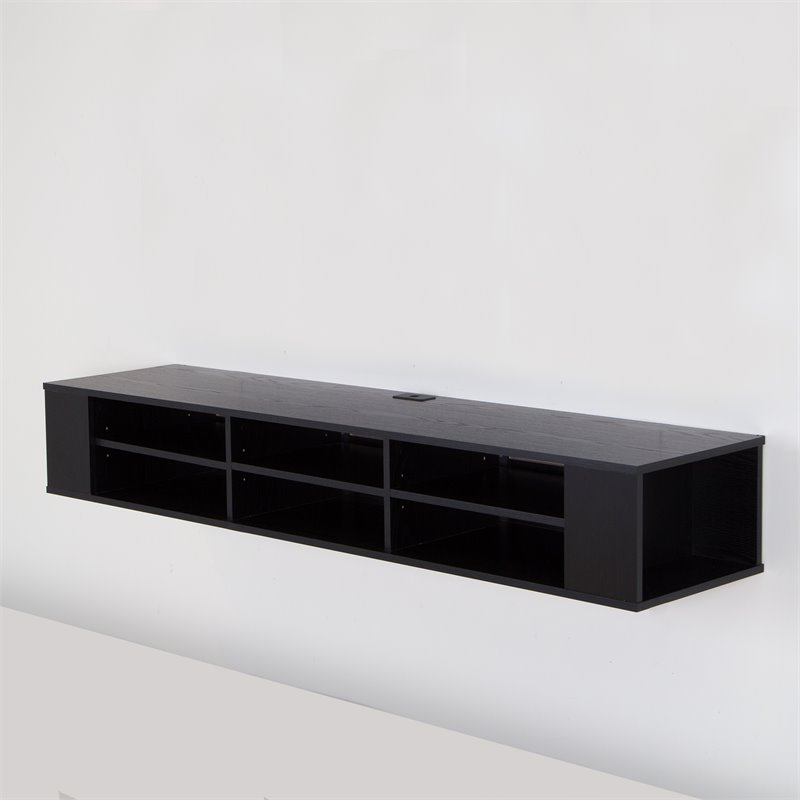 | South Shore - TV Stands - 4147677 - This modern, designer look wall mount media console will free up space and give your living room a light, airy look. Its multiple open storage spaces, and others for passing cords through, were specially designed to meet today’s electronic equipment needs. This piece will be perfect under the TV on your wall, for a truly contemporary look!Finish: Black Oak; Material: Laminated particleboard; Features 6 open storage spaces separated by adjustable shelves that can support up to 15 lb, perfect for electronic devices; 2 lateral open spaces for CDs, DVDs and video games; Can support up to 120 lb total weight; Features a hole for convenient wire management; Packaging tested and certified to reduce the risk of damage during shipment; Made in North America with non-toxic laminated particleboard; Includes metal hanging system for mounting TV stand firmly on wall (must be securely attached to a stud). Fastening device for hanging TV on wall and other accessories not included. Clean with a soft dry cloth; Meets or exceeds all North American safety standards; Requires complete assembly by 2 adults (tools not included); 5-year quality guarantee. Any questions? Contact the manufacturer, available 7/7 by phone, email or chat. Specifications:Overall Product Dimensions: 10.5'' H x 66.25'' W x 16.25'' D; Product Weight: 67.0 lbs.