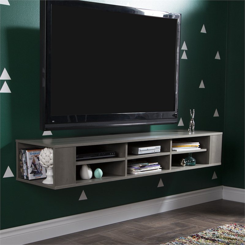 | South Shore - TV Stands - 9042677 - This modern, designer look wall mount media console will free up space and give your living room a light, airy look. Its multiple open storage spaces, and others for passing cords through, were specially designed to meet today’s electronic equipment needs. This piece will be perfect under the TV on your wall, for a truly contemporary look!Finish: Gray Maple; Material: Laminated particleboard; Features 6 open storage spaces separated by adjustable shelves that can support up to 15 lb, perfect for electronic devices; 2 lateral open spaces for CDs, DVDs and video games; Can support up to 120 lb total weight; Features a hole for convenient wire management; Packaging tested and certified to reduce the risk of damage during shipment; Made in North America with non-toxic laminated particleboard; Includes metal hanging system for mounting TV stand firmly on wall (must be securely attached to a stud). Fastening device for hanging TV on wall and other accessories not included. Clean with a soft dry cloth; Meets or exceeds all North American safety standards; Requires complete assembly by 2 adults (tools not included); 5-year quality guarantee. Any questions? Contact the manufacturer, available 7/7 by phone, email or chat. Specifications:Overall Product Dimensions: 10.5'' H x 66.25'' W x 16.25'' D; Product Weight: 67.0 lbs.