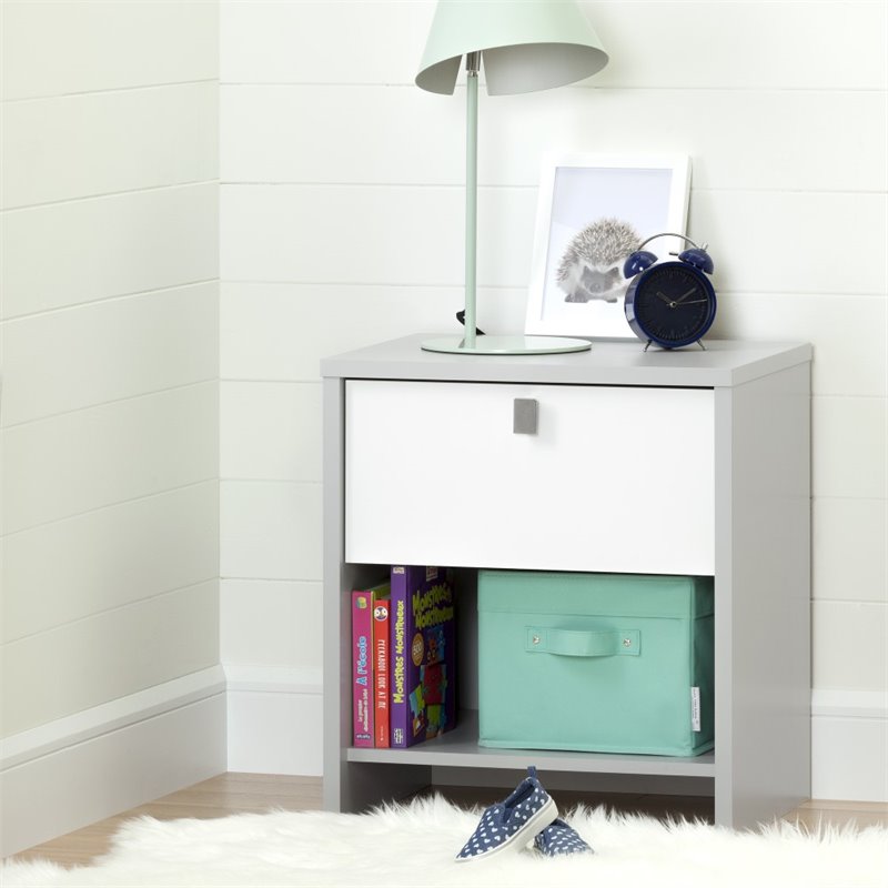| South Shore - Kids Night Stands - 10513 - As time goes by, children's interests change as their needs change. This nightstand from the Cookie collection allows the continuous evolution of a room, while adapting to each child's age and needs. Finish: Soft Gray and Pure WhiteMaterial: Laminated particleboard1 open easy-access storage spaceMetal handle in a Chrome finishMetal drawer slidesCombine with items in the Cookie collection to create a bedroom that grows with your little onePackaging tested and certified to reduce the risk of damage during shipmentMade in North America with non-toxic laminated particleboardSpecifications:Overall Product Dimensions: 23.5'' H x 21'' W x 16.5'' DProduct Weight: 35.0 lbsAccessories not included. Clean with a soft dry clothMeets or exceeds all North American safety standardsRequires complete assembly by 2 adults (tools not included)5-year quality guarantee. Any questions? Contact the manufacturer, available 7/7 by phone, email or chat