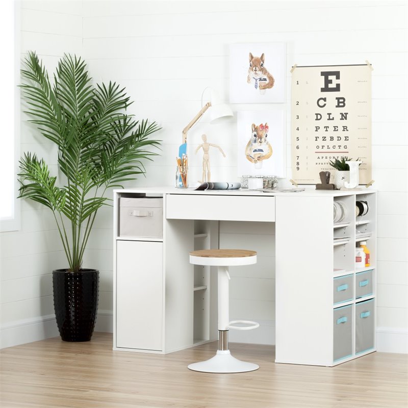 | South Shore - Writing Desks - 100179 - Whatever you’re into – be it crafts, sewing, or jewelry making – this high table from the Crea collection will allow you set up your own creative space. And the height means you can work standing up or sitting on the included adjustable stool! Finish: Pure WhiteMaterial: Laminated particleboardCounter-Height Craft Table with Storage, Adjustable Metal Stool with Wood Seat and 4 Storage BasketsLarge work surface in a scratch and water-resistant material; storage drawer under the work surfaceStorage space on either side, designed as 2 interchangeable modulesFront: 1 open space and 2 spaces behind the door separated by a removable shelfSides: small bin for rolls of wrapping paper, 2 rods for rolls of ribbon, 10 open storage spaces. Metal drawer slides. Stool: Adjustable height, bamboo seat, metal base, seat rotates a full 360 degreesAll surfaces are laminated. Packaging tested and certified to reduce the risk of damage during shipmentTable made in North America with non-toxic laminated particleboard; stool made in ChinaSpecifications:Overall Product Dimensions: 34'' H x 53.25'' W x 26.75'' DProduct Weight: 161.3 lbsOther accessories not included. Clean with a soft dry clothShips in 3 boxes, make sure to have a friend with youRequires complete assembly by 2 adults (tools not included)5-year quality guarantee on bed; 1-year manufacturer limited guarantee on stool