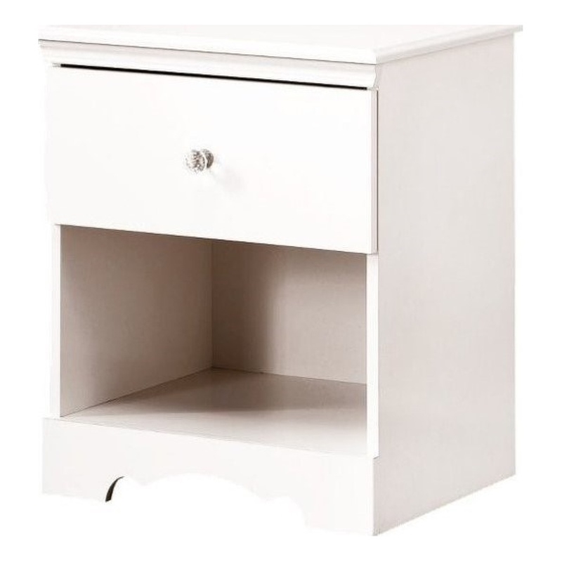 | South Shore - Nightstands - 3550062 - The perfect addition to any girls room, this night table gives delicate style to your child's personal decor. With its crystal drawer knob and stylized bottom it provides that little touch of love while also being safe with it's rounded edges. This night table will also last years of use keeping your child's night time accessories close by with its sturdy construction. Pure white finish ; Rounded edges for safety ; Adorned with beautiful clear crystal knob ; One drawer for personal journals and magazines ; Nightstand offers easy-access open storage space ; Decorative kickplate ; Constructed from engineered wood products ; Constructed of CARB compliant materials. Specifications: Overall Product Dimensions: 25""H x 20""W x 17""D ; Weight: 29 lbs .