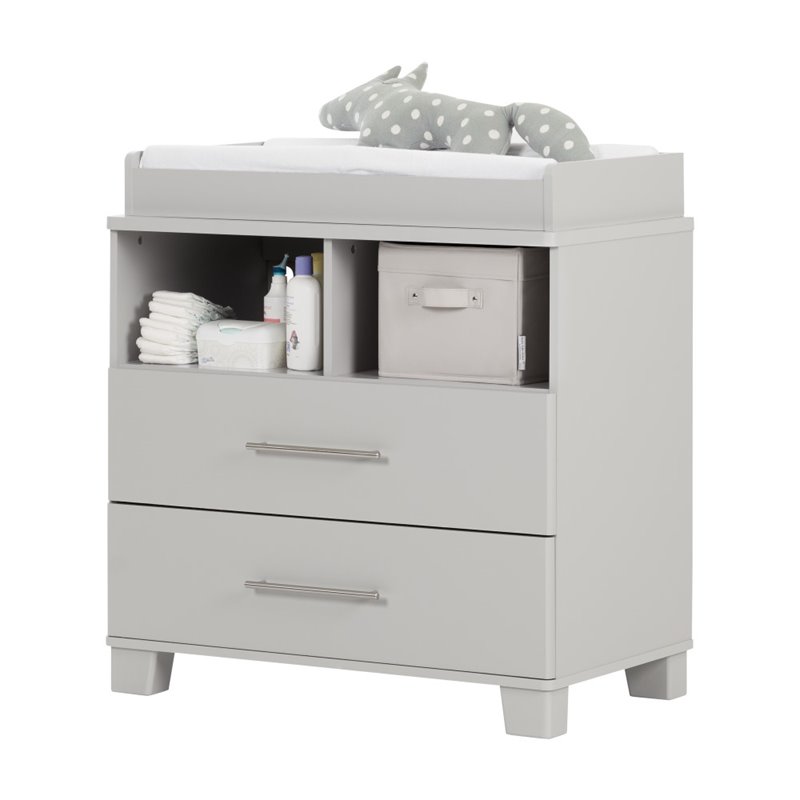 | South Shore - Baby Dressers - 10514 - We love the simplicity of this collection, which will go nicely with your nursery decor, whether you have a girl or boy — you just need to vary the wall and accessory colors. This changing table appeals to moms with trendy or more eclectic tastes. Finish: Soft GrayMaterial: Laminated particleboardThe top is removable, allowing for a transformation into a chest2 open storage spaces and 2 drawersHole in the back for better wire managementNickel-finish metal handles and wooden legsFor babies up to 30 lb. Metal drawer slidesPackaging tested and certified to reduce the risk of damage during shipmentMade in North America with non-toxic laminated particleboardSpecifications:Overall Product Dimensions: 36.75'' H x 35.5'' W x 19.5'' DProduct Weight: 106.0 lbsChanging pad and accessories not included. Clean with a soft dry clothShips in a heavy box, make sure to have a friend with you. Meets or exceeds all North American safety standardsRequires complete assembly by 2 adults (tools not included)5-year quality guarantee. Any questions? Contact the manufacturer, available 7/7 by phone, email or chat