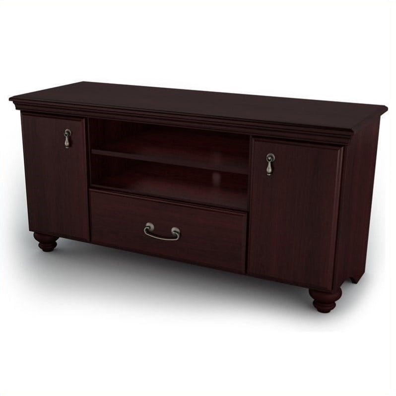 | South Shore - TV Stands - 4316662 - Find your comfort zone with a TV stand that combines the timeless look of a Dark Mahogany finish with elegantly shaped legs and sleek metal handles. Featuring classic lines and abundant storage for electronic equipment, DVDs, CDs, books or clothes, the Dover TV Stand will give your bedroom or living room a distinguished look while allowing you to organize your belongings to have a clutter-free and peaceful retreat. The gleaming metal pulls add a fresh, bright accent to the deep, dignified finish, giving the stand a hint of luster in contrast to its traditional styling which will help to match most transitional and traditional decors. Dark Mahogany finish ; Constructed of CARB compliant materials; Traditional style ; Silver finish metal handles ; Two compartments with panel doors with one adjustable shelf ; Two open storage spaces with one fixed and one adjustable shelf ; One pull out drawer ; Strong elegant legs ; Constructed of engineered wood ; Assembly is required ; Manufacturer's 5 year warranty covering defects and workmanship . Specifications: Dimensions: 23.25"" H x 47.5"" W x 17"" D ; Weight: 83 lbs .