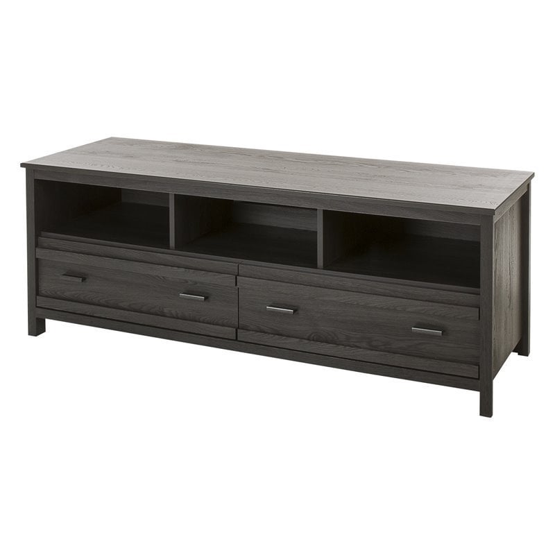 | South Shore - TV Stands - 10393 - Whether you’re looking to place your television on something or hang it on a wall, this TV stand from the Exhibit collection is just what you need. Its clean, contemporary and functional aesthetic will really help enhance your living-room. No more trailing cables – the power bar can be hidden inside the unit’s storage space. The horizontal mouldings and rich mocha finish will give your living-room a whole new look. Whether you’re looking to place your television on something or hang it on a wall, this TV stand from the Exhibit collection is just what you need. Its clean, contemporary and functional aesthetic will really help enhance your living-room. No more trailing cables – the power bar can be hidden inside the unit’s storage space.Finish: Gray OakMaterial: Non-toxic Laminated particleboardMetal handles with a Antique Pewter finishAccommodates LCD and plasma televisions up to 60"" and of up to 100 lbFeatures 3 open storage compartments, perfect for the storage of electronicsFeatures 2 practical drawersFeatures a hole in the back panel for easy and convenient wire and power bar management. Metal drawer slidesWide and open storage spaces ensure adequate ventilation for electronic devices. Opening at the back for easy wire managementPackaging tested and certified to reduce the risk of damage during shipmentAccessories not included. Clean with a soft dry clothShips in a heavy box, make sure to have a friend with you. Meets or exceeds all North American safety standardsRequires complete assembly by 2 adults (tools not included)5-year quality guarantee. Any questions? Contact the manufacturer, available 7/7 by phone, email or chat. Specifications:Overall Product Dimensions: 22.25'' H x 59.5'' W x 19.5'' DProduct Weight: 92 lbs