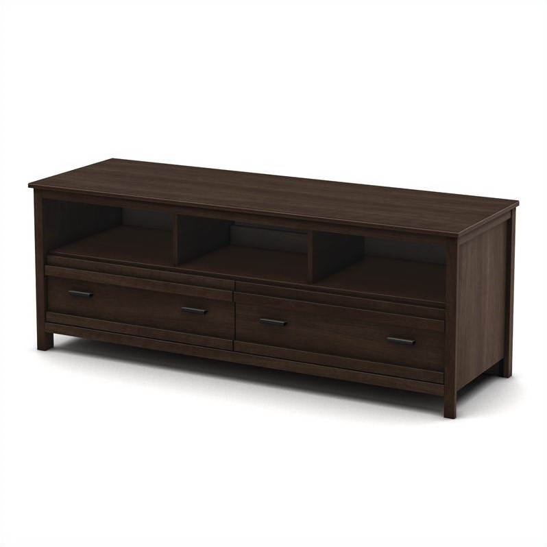 | South Shore - TV Stands - 4479677 - This Exhibit TV Stand in Mocha Brown finish features 3 wide and open storage compartments that ensure adequate ventilation for electronic devices. In addition it comes with 2 spacious drawers equipped with metal slides and antique pewter finish metal handles. Its horizontal moldings, contemporary and functional aesthetic will really help enhance your living-room. It accommodate a television up to 60-inch and can support up to 150 pounds. The interior drawer dimension is 26-3/4-inch by 14-1/4-inch front to back and 6-1/4-inch high. New and improved drawer bottoms made with wood fiber. The back surface is not laminated. Accessories not included. Manufactured from certified Environmentally Preferred laminated particle panels. Complete assembly required by 2 adults. Tools are not included. 5-Year limited warranty. Drawers feature metal handles with a Antique Pewter finish ; Rich Mocha finish and horizontal mouldings, to add style to your living-room ; Accommodates LCD and plasma televisions up to 60"" ; TV stand able to support a television of up to 200 lbs ; Features a pair of spacious drawers, for your convenience ; Features 3 open storage compartments, perfect for the storage of electronics ; Wide and open storage spaces ensure adequate ventilation for electronic devices ; Opening at the back for easy wire management ; Power bar compartment to hide wiring ; Metal drawer slides for smooth gliding ; The back surface is not laminated ; Comes in 1 box ; Complete assembly required by two adults (tools not provided) ; In order to reduce the risks of damage to a minimum during shipment of your furniture, our packaging is ISTA 3A certified ; Manufactured from eco-friendly, EPP-compliant laminated particle board carrying the Forest Stewardship Council (FSC) certification ; Made of non-toxic materials and components ; Made in Canada. Specifications:Overall product dimensions: 23"" H x 60"" W x 20""D; Weight: 92 lbs..