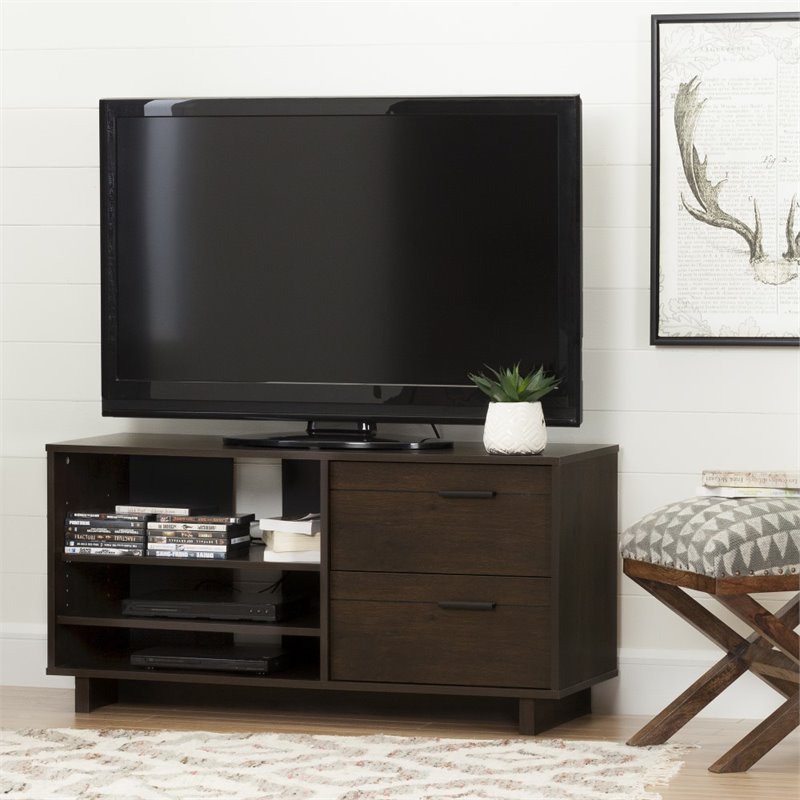 | South Shore - TV Stands - 10286 - This Fynn collection TV stand, with its asymmetric lines and trendy finish, gives you free rein when choosing accent colors. Go with a funky, uncluttered, or eclectic decor... it's completely up to you! Finish: Brown OakMaterial: Laminated particleboardCan support LCD and plasma televisions 55"" or smaller, up to 80 lb3 open storage spaces separated by 2 adjustable shelves that can support up to 25 lb2 convenient drawersMetal handles in a Black finishHole in the back panel for convenient wire management. Metal drawer slidesPackaging tested and certified to reduce the risk of damage during shipmentMade in North America with non-toxic laminated particleboardSpecifications:Overall Product Dimensions: 23.25'' H x 46.25'' W x 16.5'' DProduct Weight: 72.0 lbsTV and accessories not included. Clean with a soft dry clothMeets or exceeds all North American safety standardsRequires complete assembly by 2 adults (tools not included)5-year quality guarantee. Any questions? Contact the manufacturer, available 7/7 by phone, email or chat