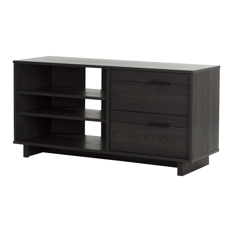 | South Shore - TV Stands - 10374 - Make your bedroom or living room into an oasis of rest and intimacy with the Fynn collection. Its straight lines and striking asymmetry were inspired by the trendiest contemporary designs, and it features a rich and modern finish that can fit just about any decor. The Fynn collection lets you create a unique decor that will never get old! This Fynn collection TV stand, with its asymmetric lines and trendy finish, gives you free rein when choosing accent colors. Go with a funky, uncluttered, or eclectic decor... it's completely up to you!Finish: Gray OakMaterial: Non-toxic Laminated particleboardCan support LCD and plasma televisions 55"" or smaller, up to 80 lbFeatures 3 open storage spaces separated by 2 adjustable shelvesFeatures 2 convenient drawersMetal handlesFeatures a hole in the back panel for convenient wire management. Metal drawer slidesPackaging tested and certified to reduce the risk of damage during shipmentTV and accessories not included. Clean with a soft dry clothMeets or exceeds all North American safety standardsRequires complete assembly by 2 adults (tools not included)5-year quality guarantee. Any questions? Contact the manufacturer, available 7/7 by phone, email or chat. Specifications:Overall Product Dimensions: 23.25'' H x 46.25'' W x 16.5'' DProduct Weight: 72 lbs