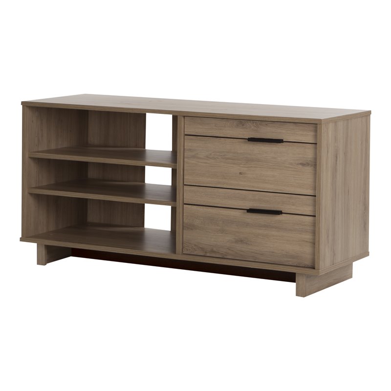 | South Shore - TV Stands - 10375 - Make your bedroom or living room into an oasis of rest and intimacy with the Fynn collection. Its straight lines and striking asymmetry were inspired by the trendiest contemporary designs, and it features a rich and modern finish that can fit just about any decor. The Fynn collection lets you create a unique decor that will never get old! This Fynn collection TV stand, with its asymmetric lines and trendy finish, gives you free rein when choosing accent colors. Go with a funky, uncluttered, or eclectic decor... it's completely up to you!Finish: Rustic OakMaterial: Non-toxic Laminated particleboardCan support LCD and plasma televisions 55"" or smaller, up to 80 lbFeatures 3 open storage spaces separated by 2 adjustable shelvesFeatures 2 convenient drawersMetal handlesFeatures a hole in the back panel for convenient wire management. Metal drawer slidesPackaging tested and certified to reduce the risk of damage during shipmentTV and accessories not included. Clean with a soft dry clothMeets or exceeds all North American safety standardsRequires complete assembly by 2 adults (tools not included)5-year quality guarantee. Any questions? Contact the manufacturer, available 7/7 by phone, email or chat. Specifications:Overall Product Dimensions: 23.25'' H x 46.25'' W x 16.5'' DProduct Weight: 72 lbs