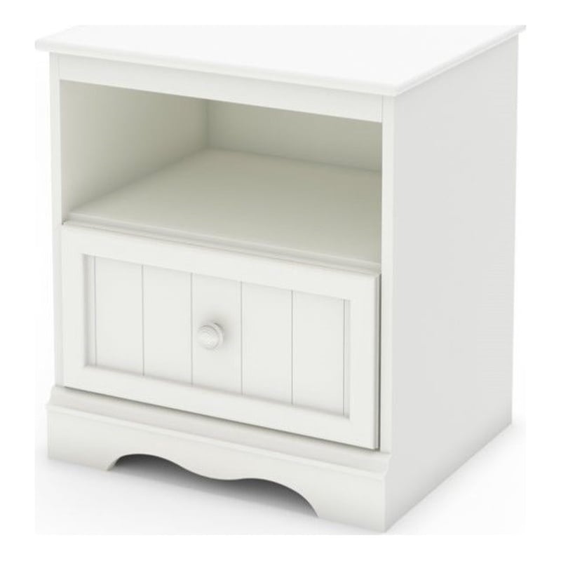 | South Shore - Kids Night Stands - 3580062 - This sturdy Handover Nightstand in Pure White finish has been made to meet your child’s needs for years to come. This look, which will never go out of style, works well with various types of décor, so you can change your little one’s bedroom to suit his or her tastes without having to think about replacing the furniture. It was designed with both maximum safety and a trendy look in mind, to give you a well ordered and highly practical room, set up to reflect the taste of the times. It creates a pleasant, comfortable space for your child. Furthermore, the Pure White wooden knobs, stylish kick plate and framed drawer front with plank effect are really confirming its Cottage Style.Pure White finishThe interior drawer dimensions are 16.75"" wide by 13.5"" front to back and equipped with plastic glidesAccessories not includedManufactured from certified Environmentally Preferred laminated particle panelsComplete assembly required by 2 adultsTools are not included5-year limited warrantyMade in CanadaSpecifications:Overall Product Dimensions: 21"" H x 23"" W x 16"" DWeight: 32 lbs
