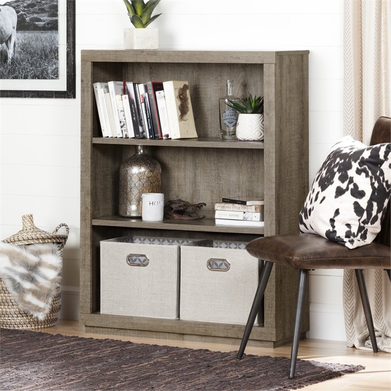 | South Shore - Bookcases - 10483 - The rustic finish on this small bookcase means it’ll blend wonderfully into your room! Its large moldings will give your storage unit a touch of relief and breadth, while adding a contemporary look to your decor. You’ll be charmed by this piece! Finish: Weathered Oak; Material: Laminated particleboard; Practical shelving unit; Large moldings for a bold and robust look; 3 open storage spaces, separated by 2 adjustable shelves (can support up to 50 lb) and 1 fixed (can support up to 25 lb); Ideal for your books, binders or decorative items; it can meet all your storage needs.; Can fit on your living room or home office; Packaging tested and certified to reduce the risk of damage during shipment; Made in North America with non-toxic laminated particleboard; Accessories not included. Clean with a soft dry cloth; Ships in a heavy box, make sure to have a friend with you. Meets or exceeds all North American safety standards; Requires complete assembly by 2 adults (tools not included). Specifications:Overall Product Dimensions: 46.25'' H x 35.25'' W x 12.375'' D; Product Weight: 59.0 lbs; 5-year quality guarantee. Any questions? Contact the manufacturer, available 7/7 by phone, email or chat.