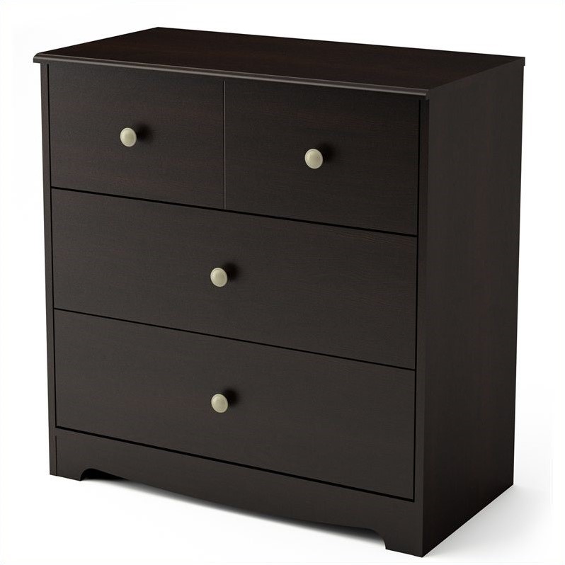 | South Shore - Chests - 3169033 - This Little Teddy 3-Drawer Chest in Espresso finish is characterized by its rounded kick plate, decorative groove on the drawers and elegant nickel finish metal handles. It features 3 practical drawers equipped with metal slides. A Pure White version with Crystal knobs also available. Pair it with the Little Teddy Changing Table and a South Shore Crib to create a stylish and practical room. It measures 31-1/2-inch wide by 16-1/2-inch deep by 32-1/4-inch high. The interior drawer dimension is 28-inch wide by 13-3/4-inch front to back by 4-1/4-inch high. It is delivered in a box measuring 37-1/4-inch by 17-1/2-inch by 7-1/2-inch and weighing 73 pounds. New and improved drawer bottoms made with wood fiber. The back surface is not laminated. Accessories not included. Manufactured from certified Environmentally Preferred laminated particle panels. Complete assembly required by 2 adults. Tools are not included. 5-year limited warranty. Made in Mexico.Features 3 practical drawers equipped with metal slidesA Pure White version with Crystal knobs also availableNew and improved drawer bottoms made with wood fiber. Accessories not included. Complete assembly required by 2 adults. Tools are not included. 5-year limited warranty. Made in Canada.Style: CountryFinish: ChocolateSpecifications:Overall Product Dimension: 32.25"" H x 31.5"" W x 16.5"" DWeight: 61 lbs
