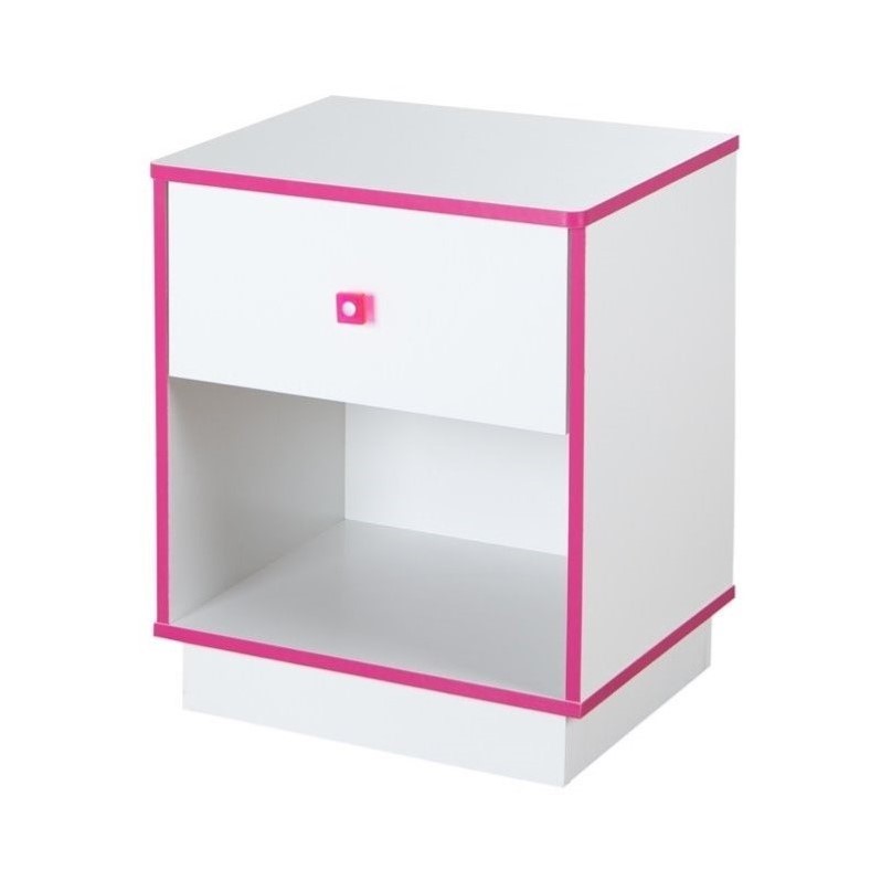 | South Shore - Kids Night Stands - 9039062 - The Logik collection’s charm resides in its contemporary style, highlighted by its items’ recessed bases. The designers paid special attention to storage and safety by making the corners rounded. This gorgeous bedroom set suits many types of decor perfectly. This night stand with bright pink edgebanding is just what you need to add a feminine touch to your little princess’s room. It’s perfect for your storage needs and your daughter’s room will be a true reflection of her personality!Finish: Pure White and Pink1 Practical DrawerFeatures an open storage space ideal for bedtime booksClear pink square plastic handles with metal centersPlatform base for a great contemporary lookMetal slides for smooth glidingClean with a soft dry clothSafety is an integrated part of our values: this product meets or exceeds all North American safety standardsSpecifications:Overall Product Dimensions: 23.25"" H x 19.5"" W x 16.5"" DOverall Product Weight: 26 lbs5-year quality guarantee
