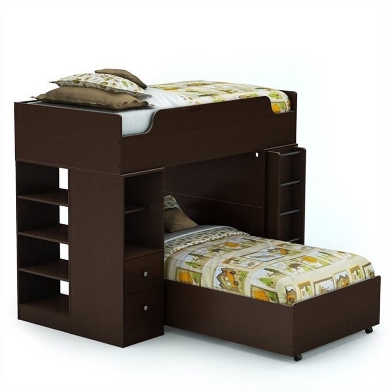 | South Shore - Bunk Beds - 3359A3 - This loft bed is a great solution for optimizing space in small bedrooms. It has been designed to be both safe and practical, with lots of storage space. It is composed of a loft bed storage unit, a top bed, a ladder and a loft bed desk. Includes: Loft Bed Storage Unit ; Loft Bed Desk ; Loft Top Bed and Ladder . General Loft Bed manufactured from recycled CARB compliant laminated particle panels ; Chocolate finish ; Twin size ; Contemporary style ; ASTM certified ; Ready to assemble ; Made of EPP certified panels (Environmentally Preferred Product) ; Packaging is ISTA 3A-certified to ensure its integrity and your total satisfaction ; Manufacturer 5-year limited warranty ; Made in Canada . Loft Bed Storage Unit 2 practical drawers ; Equipped with polymer glides that includes dampers and catches for enhanced safety . 1 adjustable shelf above the drawers . Easily accessible open storage compartments ; 4 fixed shelves that are accessible from either side (bedside or outside) . Loft Bed Desk 1 practical drawer ; Equipped with polymer glides that includes dampers and catches for enhanced safety . 1 fixed shelf underneath the working surface ; Hole through which to pass wires for better wire management ; Built-in light . Loft Top Bed and Ladder Twin size bed ; 5-rung ladder ; Rounded corners for added safety ; Full back panel ; No box spring required . Specifications: Overall Dimensions: 61.75"" H x 42"" W x 76.5"" D ; Weight: 113 lbs ; Weight Limit: 200 lbs .