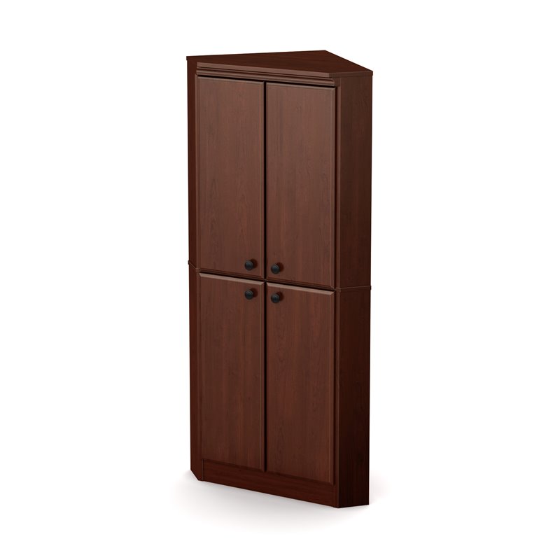 | South Shore - Armoires - 10388 - The Morgan collection provides abundant storage solutions for a pleasantly well-organized room. Its finish adds a touch of elegance that blends well with any décor. This storage cabinet is both stylish and practical, perfect for all storage needs. The corner configuration means you can make optimal use of the space in your room… and add some style as well. It works well in any room, whether it is the office, bedroom, basement, or even the entryway.Finish: Royal CherryMaterial: Non-toxic Laminated particleboardBehind the doors: 4 storage spaces (2 adjustable shelves, 1 fixed)Each shelf can support up to 25 lbCorner configuration: perfect for smaller spacesMetal knobs in a Black finishPackaging tested and certified to reduce the risk of damage during shipmentAccessories not included. Clean with a soft dry clothShips in a heavy box, make sure to have a friend with you. Meets or exceeds all North American safety standardsRequires complete assembly by 2 adults (tools not included)5-year quality guarantee. Any questions? Contact the manufacturer, available 7/7 by phone, email or chat. Specifications:Overall Product Dimensions: 62.5'' H x 29.75'' W x 21'' DProduct Weight: 96 lbs