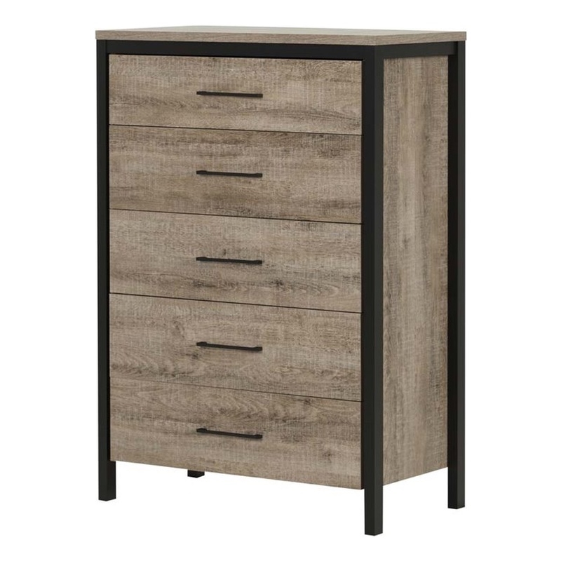 | South Shore - Chests - 10492 - Create your dream decor with this modern farmhouse style chest from the Munich collection by South Shore! The rich finish and black accents give it an industrial look that’ll add some punch to your room. And, as a bonus, you get 5 drawers for handy storage. Finish: Weathered Oak; Material: Laminated particleboard; Framed with Matte Black moldings; Black metal handles; Metal drawer slides; Packaging tested and certified to reduce the risk of damage during shipment; Made in North America with non-toxic laminated particleboard; Accessories not included. Clean with a soft dry cloth; 5-year quality guarantee; Assembly Required. Specifications:Overall Product Dimensions: 45.75'' H x 31.38'' W x 16.5'' D; Product Weight: 95.0 lbs.