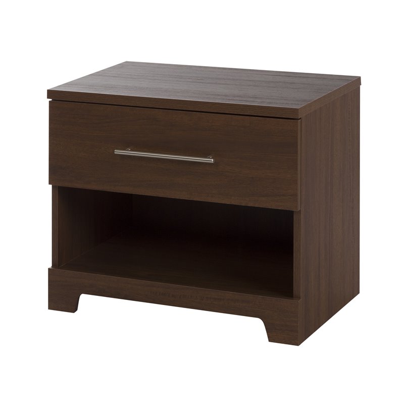 | South Shore - Nightstands - 10335 - The magnificent Primo collection is a simple, elegant piece that will only make your bedroom that much better. It provides the storage space you need, while giving the room a trendy, uncluttered look. The contemporary design means it will blend easily with your décor and your favorite accent colors. Its long, linear handles, along with its cut-out kickplates, make for a minimalist design, so your room will stay in style for years. Thanks to the Primo collection, create your own personalized décor! This magnificent nightstand from our Primo collection is a simple, elegant piece that will only make your bedroom that much better. It provides the storage space you need, while giving the room a trendy, uncluttered look. The contemporary design means it will blend easily with your décor and your favorite accent colors. Its long, linear handles, along with its cut-out kickplate, make for a minimalist design, so your room will stay in style for years. Round out your furnishings by adding the other items in this collection… and create your own personalized décor!Finish: Brown WalnutMaterial: Non-toxic Laminated particleboardMetal handles with a Nickel finishFeatures 1 open easy-access storage spaceFeatures 1 practical drawerMetal drawer slidesPackaging tested and certified to reduce the risk of damage during shipmentAccessories not included. Clean with a soft dry clothRequires complete assembly by 2 adults (tools not included)5-year quality guarantee. Any questions? Contact the manufacturer, available 7/7 by phone, email or chat. Specifications:Overall Product Dimensions: 20.47'' H x 23.35'' W x 16.3'' DProduct Weight: 32 lbs