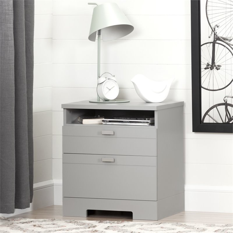 | South Shore - Kids Night Stands - 10271 - Use this nightstand from the Reevo collection to add storage space to your kids’ room and your own! Thanks to its neutral finish, you can follow the same general guideline throughout, and still go crazy, creating decors in the colors of your choice. Finish: Soft GrayMaterial: Laminated particleboardEasy wire management: you can charge a phone, a tablet, and other electronic devicesSliding shelf with and included cable grip for keeping cords togetherHole in back panel to pass cords through, and space in back for a power bar1 open easy-access storage spaceMetal handles in a Brushed Nickel finish. Decorative groove at the top of each drawer frontMetal drawer slidesPackaging tested and certified to reduce the risk of damage during shipmentMade in North America with non-toxic laminated particleboardSpecifications:Overall Product Dimensions: 23.35'' H x 21'' W x 17.64'' DProduct Weight: 39.0 lbsPowerbar and accessories not included. Clean with a soft dry clothMeets or exceeds all North American safety standardsRequires complete assembly by 2 adults (tools not included)5-year quality guarantee. Any questions? Contact the manufacturer, available 7/7 by phone, email or chat