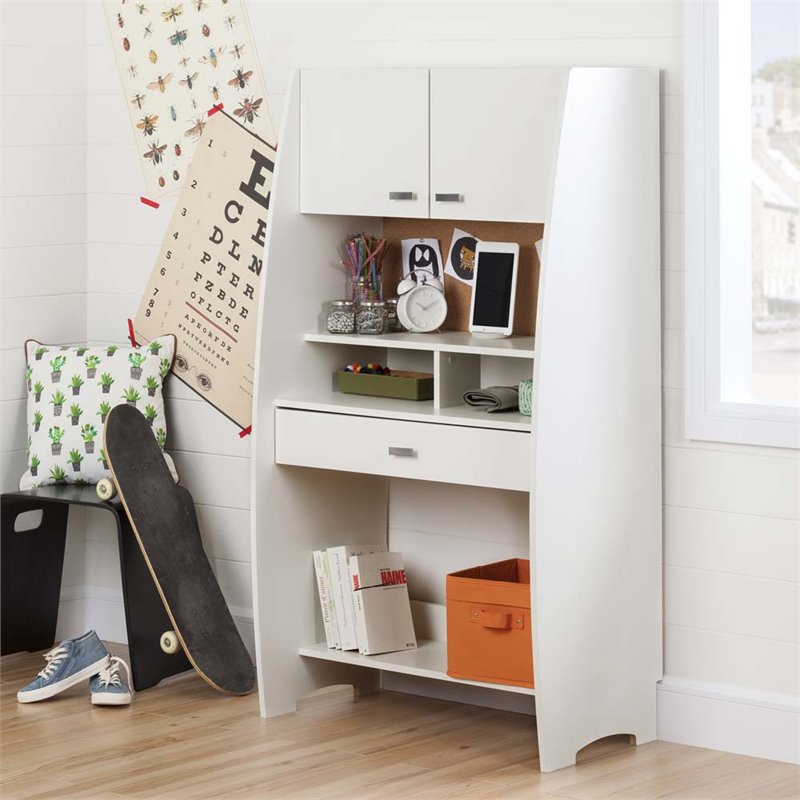 | South Shore - Writing Desks - 10196 - Here's a desk for any member of the family, from South Shore's Reevo collection! With its handy storage, contemporary style, many ingenious features, and a configuration that’ll work anywhere, you’ll wonder how you could have done without it. The retractable work surface has a drawer below, to give you the space you need – when you need it. Finish: Pure White; Material: Laminated particleboard; Drawer: With a retractable work surface that locks in place; “School desk” style storage: The top of the work surface opens up, so you can store books and pencils inside; A base for your tablet, with a hole for passing the cord through; Cork board. Open spaces: 1 large shelf and 2 smaller ones above the drawer, 1 large shelf under it; Closed space: Behind the 2 doors, 1 large storage space; Upright configuration works in the living room, the bedroom, or the hallway; Metal handles, with a nickel finish; Fully extendable metal drawer slides, with notches; Packaging tested and certified to reduce the risk of damage during shipment. Specifications:Overall Product Dimensions: 59.5'' H x 33'' W x 18.25'' D; Product Weight: 96.0 lbs; Accessories not included. Clean with a soft dry cloth; Ships in a heavy box, make sure to have a friend with you. Meets or exceeds all North American safety standards; Requires complete assembly by 2 adults (tools not included); 5-year quality guarantee. Any questions? Contact the manufacturer, available 7/7 by phone, email or chat.