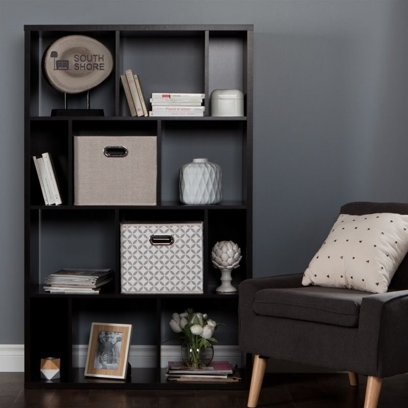 | South Shore Reveal 12 Cubby Wood Bookcase in Chocolate with 2 Baskets |
