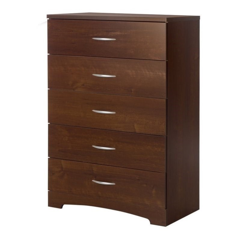 | South Shore - Chests - 10110 - Add grace and style to your bedroom with Step One. This elegant collection combines minimalist lines and sober metal handles with a rich finish to give your room a modern and sophisticated feel. The kick plates add an accent of modernity and a touch of sophistication with their slightly curved lines, and the simple metal handles contrast with the finish, highlighting the collection’s original and casual look. Thanks to its neutral finish and timeless look, this dresser features sleek lines and blends perfectly into today's trendiest decors. This collection was designed just for tighter spaces! The furniture lets you picture a simple décor that's brought to life through the use of bright colors. Let your imagination go wild, and see where it takes you!Finish: Sumptuous Cherry5 Practical DrawersMetal handles in a Brushed Nickel finishMetal drawer slides for smooth glidingClean with a soft dry clothPackaging tested and certified to reduce the risk of damage during shipmentMade in Mexico with non-toxic laminated particleboardSpecifications:Overall Product Dimensions: 45.63"" H x 31.3"" W x 16.3"" DOverall Product Weight: 91 lbs5-year quality guarantee