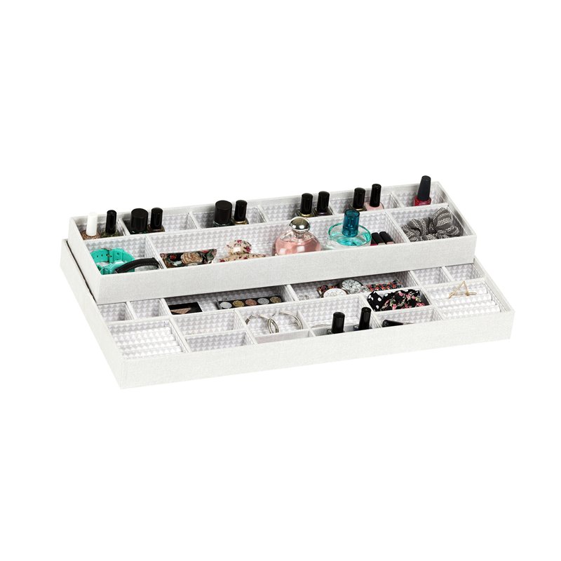 | South Shore - Baskets - 100048 - Practical and stylish, the Storit collection of storage pieces is perfect for keeping order in your office, bedroom or living room and making your life easier. Open and closed storage spaces provide endless eye-catching yet functional possibilities—just let your imagination run wild! Also available in a Chocolate finish. All items sold separately. Closet poles are not included. A place for everything, and everything in its place. With these space saving jewelry drawer organizers, makeup, jewelry, and other small accessories will always be in their place. Each organizer features multisize compartments and is the right size to fit into most of our dressers.Finish: BeigeMaterial: PolyesterPack of 2 organizersMultisize compartmentsPerfect for jewelry and makeupFits into most of South Shore dressersOuter fabric: 100% polyester. Inner Fabric: 100% PolypropyleneSmaller compartment slides on the bigger onePackaging tested and certified to reduce the risk of damage during shipmentClean with a damp cloth30-day satisfaction guarantee. Any questions? Contact the manufacturer, available 7/7 by phone, email or chat. Specifications:Overall Product Dimensions: 2'' H x 13'' W x 25'' DProduct Weight: 5.75 lbs