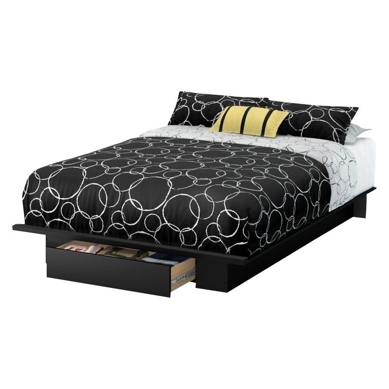 | South Shore - Beds - 3370215 - This Trinity Platform Bed in Pure Black finish with straight, clean lines and decorative moulding looks classy. It will serve as a perfect economical solution, since it requires no box spring. This contemporary style platform bed is sturdy and has a firm structure. In addition, it includes a large drawer on full-extension metal glides that can be opened easily without the need for handles.Pure Black finish1 large drawer on full-extension metal glidesThe interior drawer dimensions are 31-inch wide by 19-3/4-inch front to backWeight capacity of 500 poundsCan be used with full or queen size mattressesManufactured from certified Environmentally Preferred laminated particle panels Complete assembly required by 2 adults Tools are not included 5-year limited warrantySpecifications:Overall Product Dimensions: 8.5"" H x 60"" W x 80"" DWeight: 142 lbs