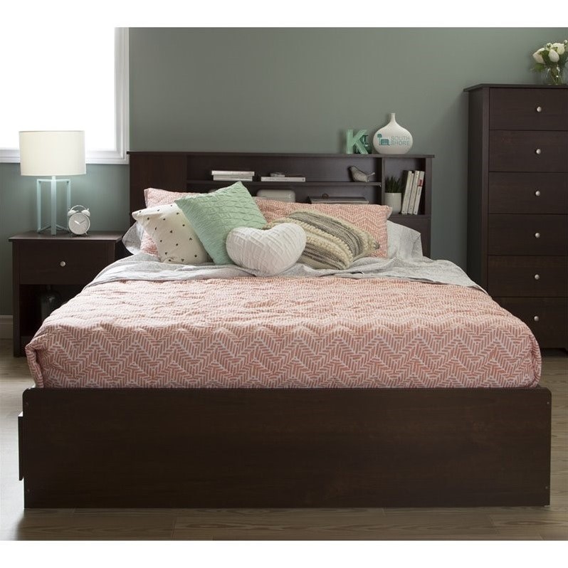 | South Shore - Beds - 1008586PKG - South Shore Vito Wood Full Queen Bookcase Headboard in CherryThe transitional-style Vito collection is a perfect blend of minimalist style and functionality. It features abundant open and closed storage space and stands out for its simple but refined lines and cute round handles that bring a touch of softness. This tasteful bedroom set will surround you in a soothing atmosphere after a long day. With its many easy to access open storage compartments, this full/queen bookcase headboard (54/60'') is perfect for fulfilling bedside storage needs. A storage space accessible from the side of the headboard may be placed on either the right or left depending on your preference.Finish: Sumptuous CherryFeatures practical and accessible open storage spaces, separated by fixed shelvesThe accessible side storage can be placed on the left or right of the bedFeature 1 hole in the back panel for better wire managementClean with a soft dry clothSpecifications:Overall Product Dimensions: 40.25"" H x 63.5"" W x 9"" DOverall Product Weight: 58 lbs5-year quality guaranteeSouth Shore Vito Queen Storage Bed with Drawers in Sumptuous CherryThe Vito storage bed stands out for its minimalist style and practicality with its simple refined lines, clean shapes, and discreet storage drawers. Minimalist and simple on purpose, the Vito storage bed proves easy to style with whether you add matching bedroom pieces to the room or combine it with differently finished pieces for a more eclectic feel. Finish: Sumptuous Cherry; Material: Wood; Platform configuration; 2 storage drawers; Cut-out bottom of the drawer fronts to eliminate need for handles; Reversible configuration so optional headboard can be attached to either end for access to drawers; Box spring not required; 5-year quality guarantee. Care:Clean with a soft dry cloth. Specifications:Overall Product Dimensions: 14"" H x 62"" W x 82"" D; Overall Product Weight: 152 lbs.